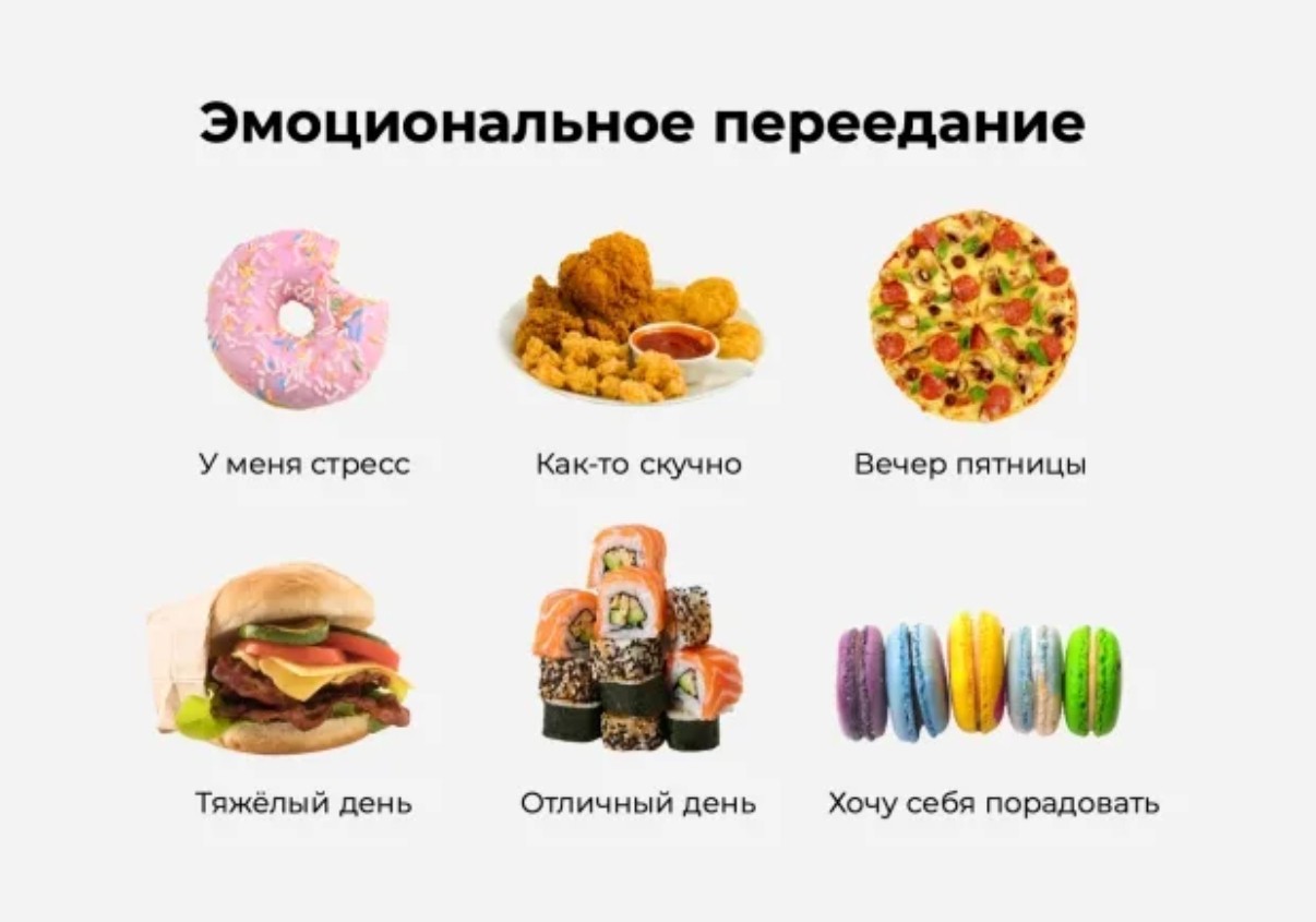 Самые часто встречающие триггеры - это стресс, усталость, одиночество, вознаграждение едой. Поэтому никогда не исключаем эмоциональную составляющую.