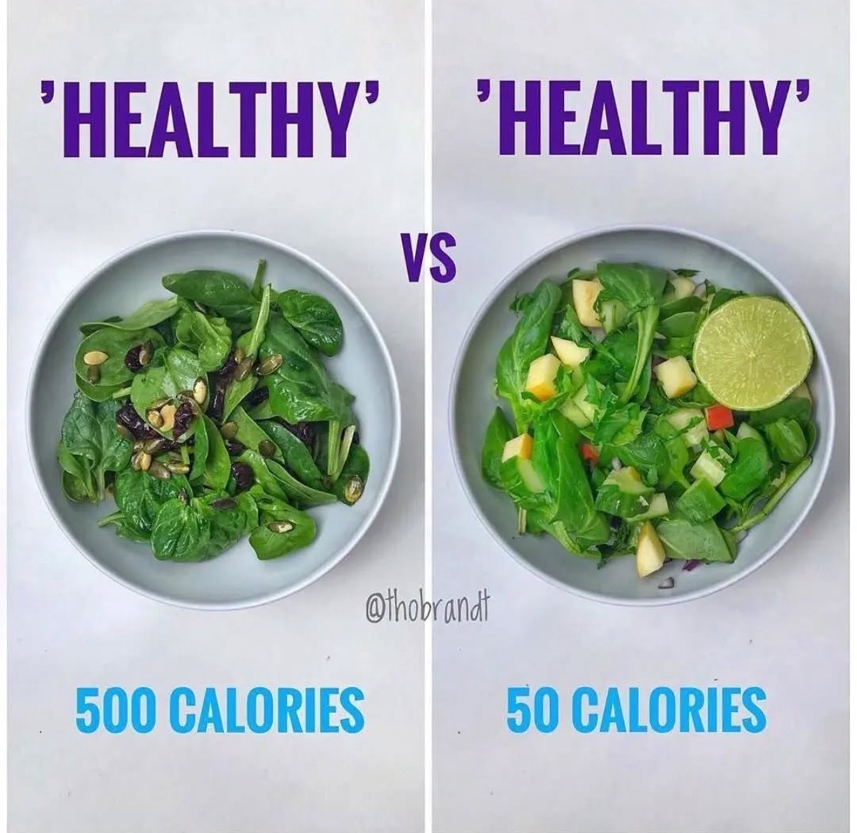 Жиры — полезны, но они очень калорийные, важно соблюдать баланс. Пара столовых ложек масла, горсть орехов может увеличить калорийность обычного листового салата до размеров полноценного обеда, а если это все залетает с авокадо, жирной рыбкой и дополнительным кусочком сыра, то про дефицит можно забыть. Даже если тебе кажется, что ты съела немного по объему, это может быть много по калориям.